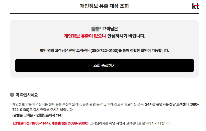 - 고객 성명과 생년월일 등 민감 정보는 KT를 통해 유출되지 않음